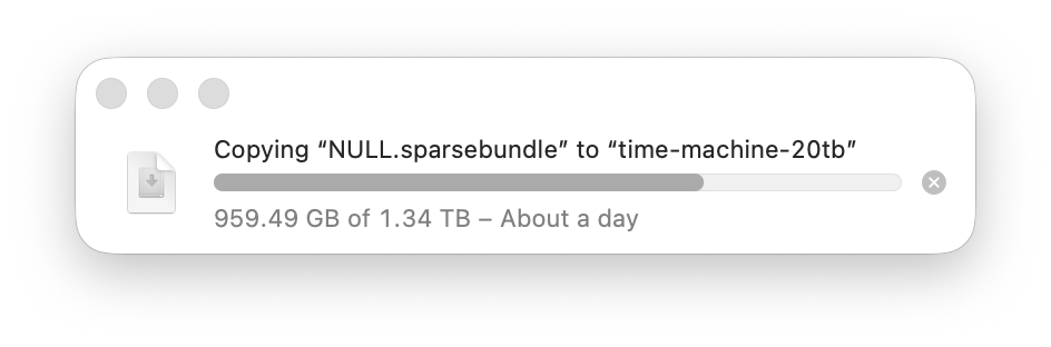 Okay, easy, I thought — I’ll just copy the Time Machine backup (a sparsebundle) from one of the 4TB drives over to the 20TB. Turns out this isn’t easy, but I will walk you through the steps I took that did work. At the end, I’ll cover what didn’t work just in case you’re curious.